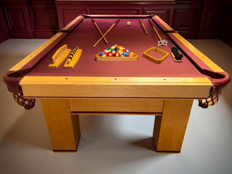 8’ American Classics Custom Billiards Table 3 piece slate – high quality 1” thick Leather drop pockets Burgundy accented bamboo body New high-speed cushions New Championship Invitational Cloth included Accessories included: Balls, 8Ball Triangle, 9Ball Diamond, Cues, matching wall-mount Cue Rack, Matching Brush & Chalk Professionally delivery & install included by Billy Yards Billiards